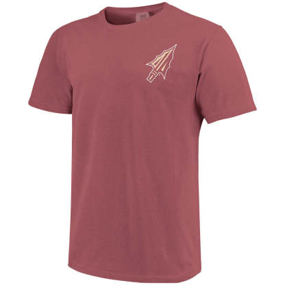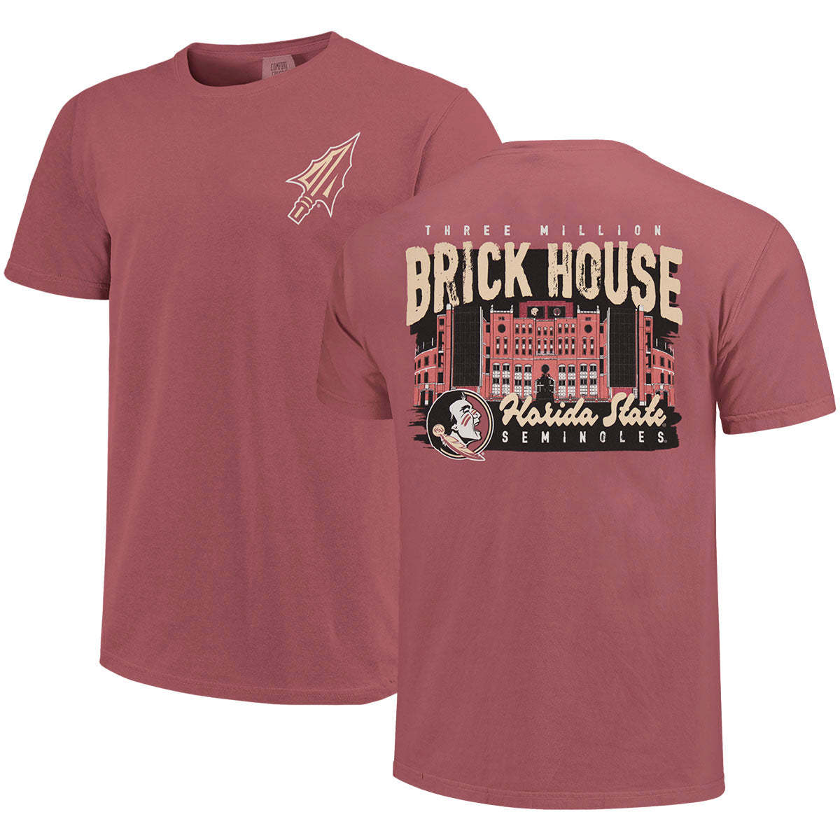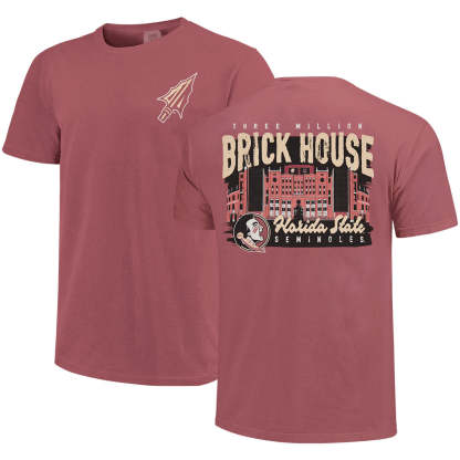 Material | 100% Cotton. Color | Brick. Comfort Colors short sleeve t-shirt with screen printed Arrowhead. Screen printed Brick Houser Seminole Head Florida State Seminoles Doak Campbell Stadium design.