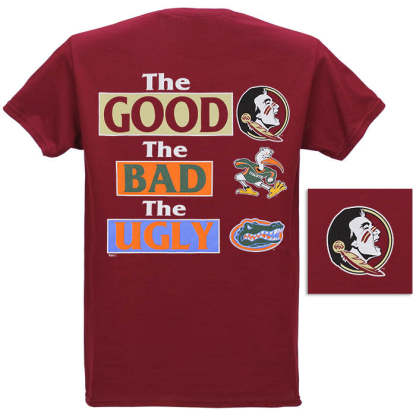 Garnet t-shirt features The Good, Bad, and Ugly graphic on back with Seminole head logo at left breast.